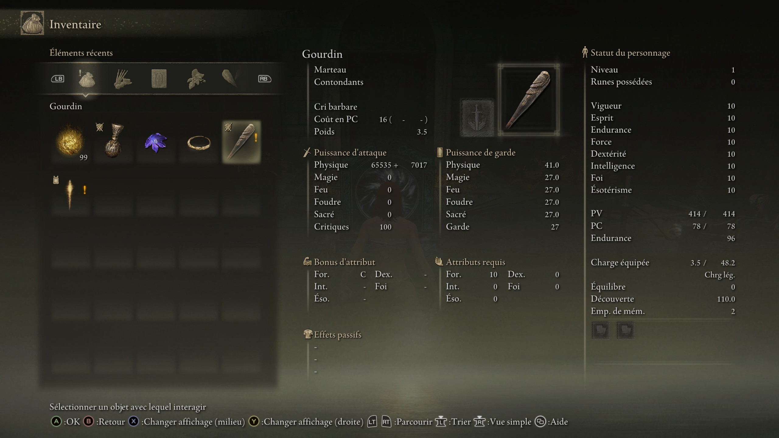 - Arme Indigent avec dégâts maxés (OS quasi tout le jeu)